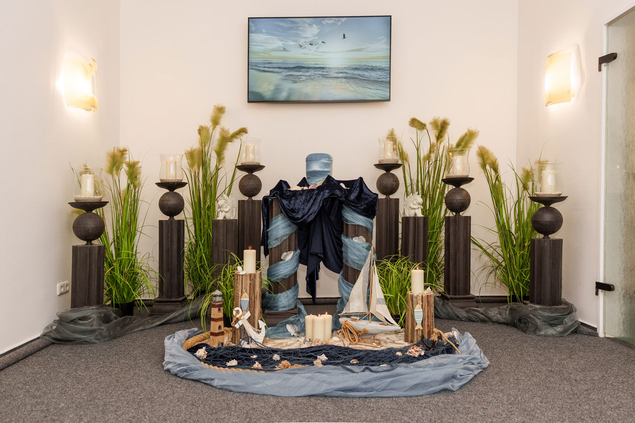 Bei einer Beisetzung auf dem Friedhof können wir für die Trauerfeier in der Regel die örtliche Kapelle nach Ihren Wünschen dekorieren. Gerne stellen wir Ihnen aber auch unseren hauseigenen Abschiedsraum mit etwa 60 Plätzen zur Verfügung. Der Zugang ist barrierefrei, ausreichend Parkplätze sind vorhanden. Mit dem Angebot möchten wir vor allem auch solchen Familien eine Möglichkeit zu einer Abschiednahme in größerem Kreis geben, die sich für eine anonyme Beisetzung, eine Beisetzung in einem Bestattungswald oder auch für eine Seebestattung entscheiden.