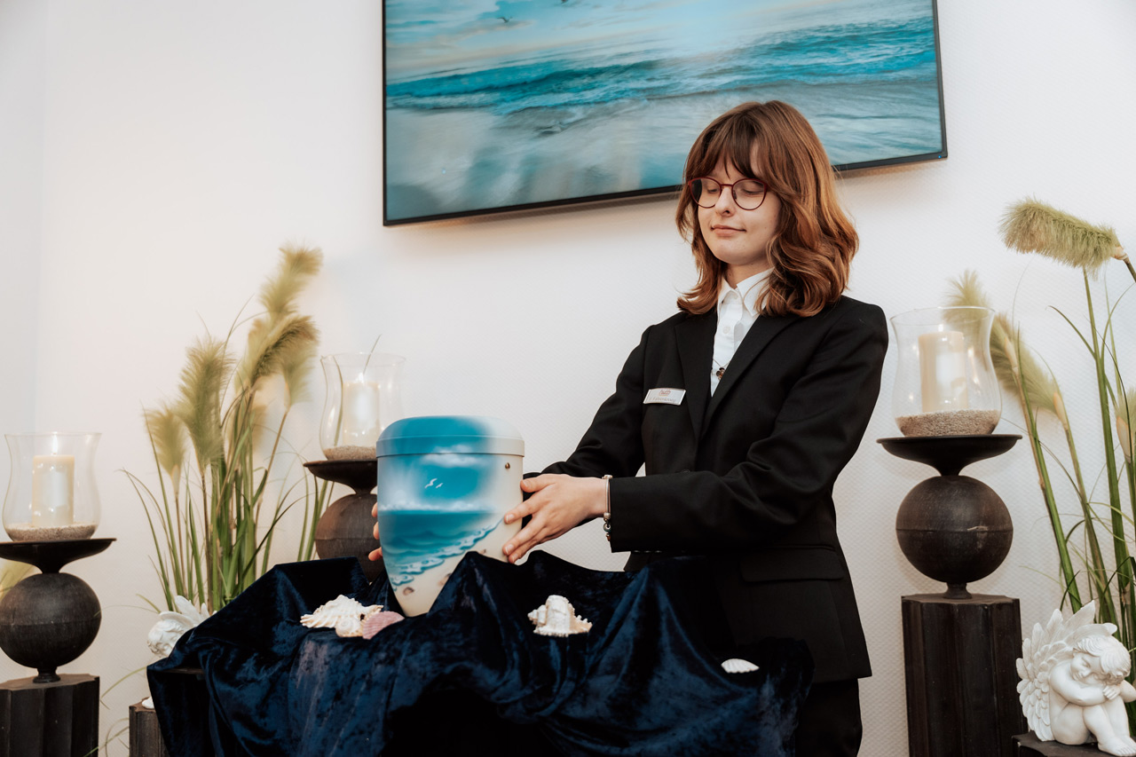 Bestattungen sind mehr oder weniger öffentliche Zeremonien, bei denen auch entferntere Bekannte dem Verstorbenen die letzte Ehre erweisen können. Unsere Aufgabe als Bestatter sehen wir aber vor allem darin, Ihnen als nächste Angehörige einen ganz persönlichen Abschied zu ermöglichen. Einen Abschied, der es Ihnen erlaubt, Ihre Erinnerungen so zu sortieren, dass Sie gut weiterleben können. Deshalb ermöglichen wir Ihnen gerne letzte Momente am offenen Sarg und unterstützen Sie, wenn Sie selbst beim Einbetten oder bei der Gestaltung der Trauerfeier mitwirken möchten.